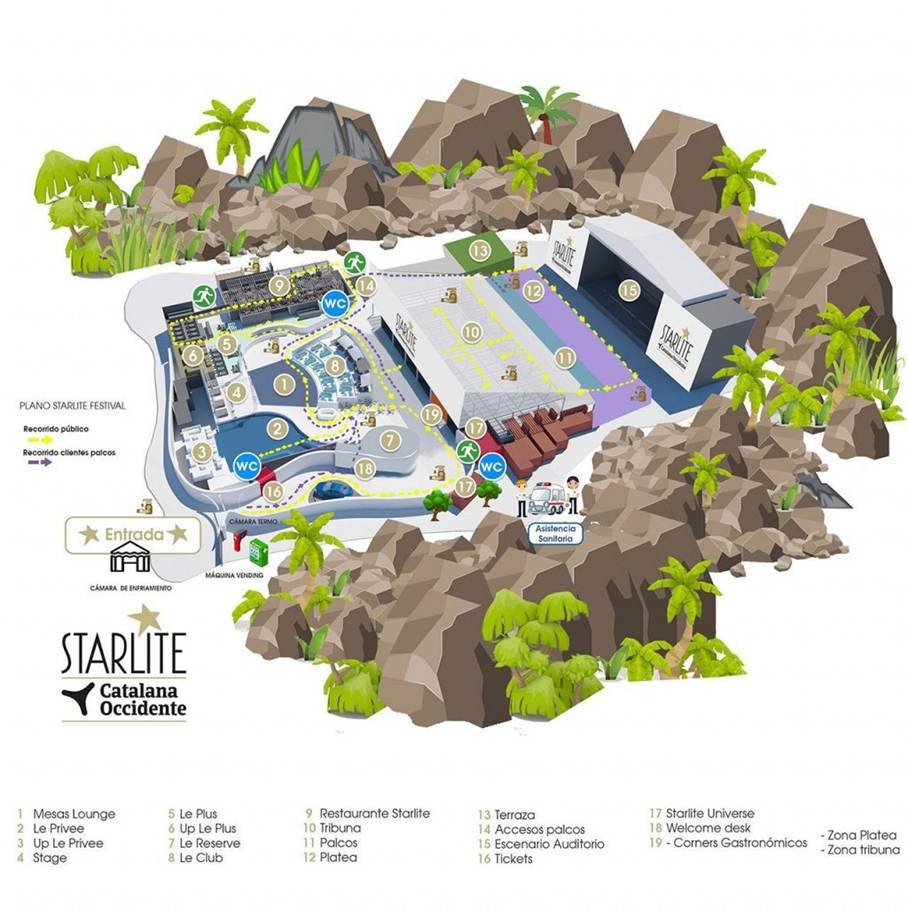 Festiwal Starlite rozpoczyna się jeszcze przed samym koncertem, kiedy to goście mogą korzystać z bogatej oferty gastronomicznej w atmosferze letniego tarasu. Amfiteatr posiada zarówno miejsca siedzące, jak i strefę VIP, a na terenie znajdują się liczne restauracje i bary. Po każdym koncercie można przejść do strefy z dużym parkietem do tańca, kontynuując wieczór przy muzyce DJ, przeplatanej z występami artystów czy pokazami tanecznymi.
